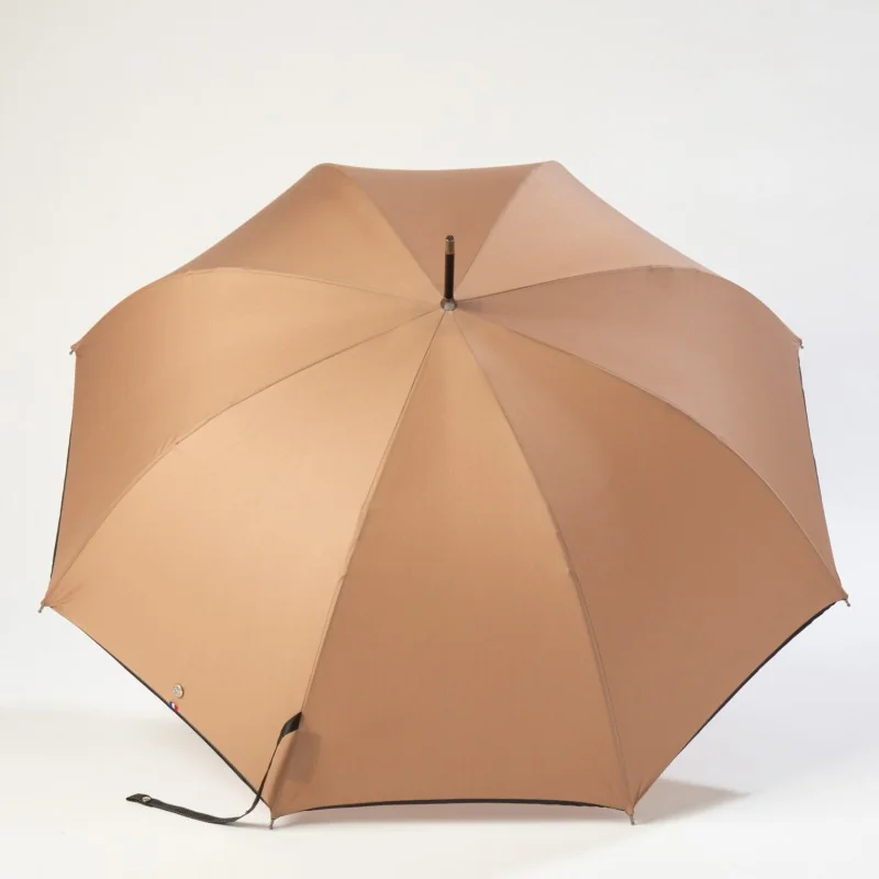 Dieser hochwertige Stockschirm ist mit einem Stahlschaft ausgestattet, dessen eleganter Griff aus Ahornholz gefertigt ist. Acht Fiberglas-Speichen stützen das braune Polyestersegel mit schwarzem Rand und machen es windbeständig.