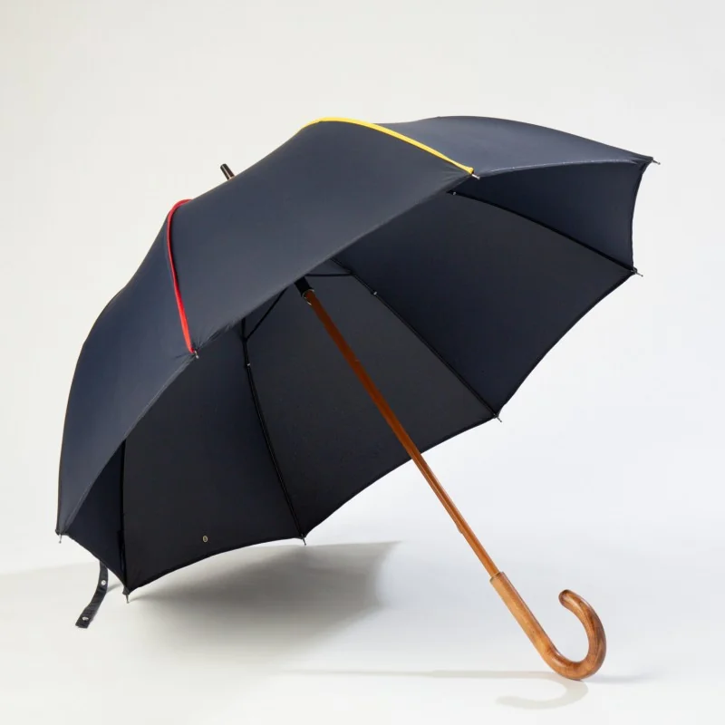 H2O Parapluies bietet einen marineblauen Stockschirm mit einem Schrägstreifen in den Farben Deutschlands an. Er ist mit einem zuverlässigen Mechanismus zum manuellen Öffnen ausgestattet.
