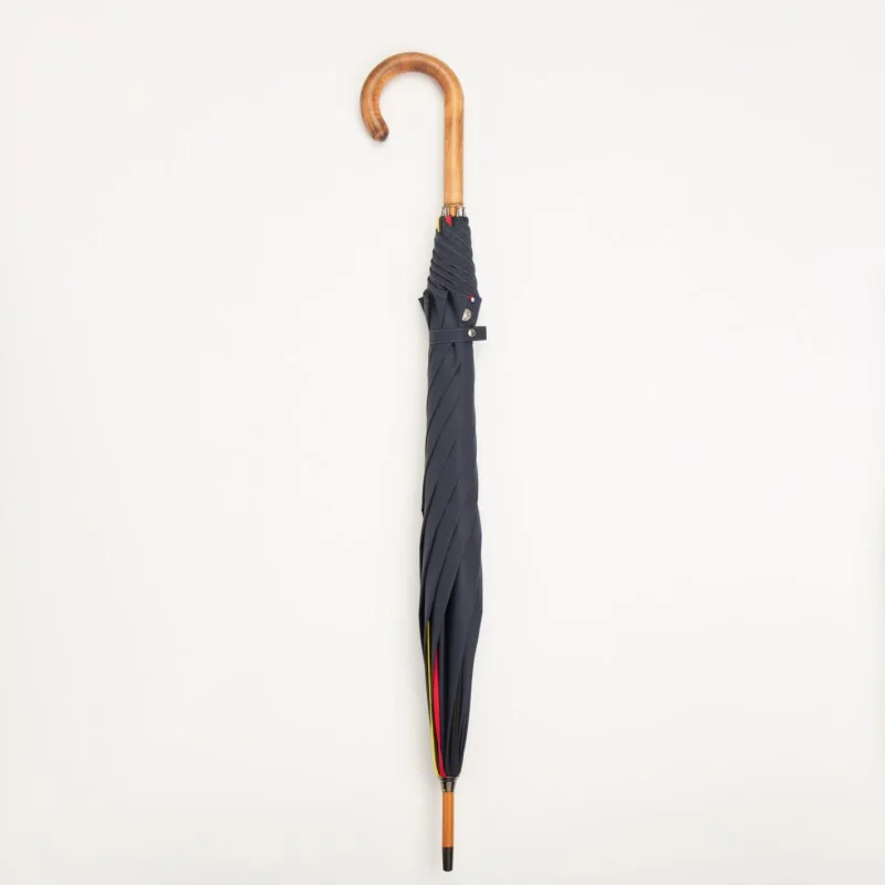 Dieser hochwertige Regenschirm ist mit einem Holzmast und einem eleganten Griff aus Ahornholz ausgestattet. Acht Speichen aus gehärtetem Stahl stützen das marineblaue Polyestergewebe, und dreifarbige deutsche Kanten sorgen für Windbeständigkeit.
