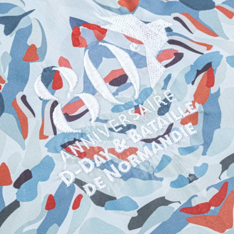 Das offizielle Logo zum 80. Jahrestag der Landung in der Normandie ist in Weiß auf eine der Seiten des Regenschirms gestickt.