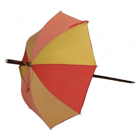 Auf einer langen Stange aus Kastanienholz montiert, kann er, wenn er geschlossen ist, dank seines umgedrehten Griffs (an der Spitze des Schirms) und seines extrem widerstandsfähigen Metalldorns als Wanderstock verwendet werden, um den Rhythmus der Wanderungen zu erleichtern.