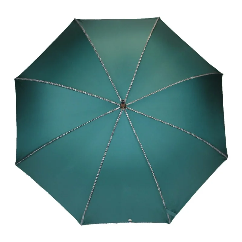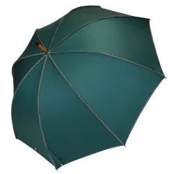 This top-of-the-range umbrella is an aesthetic jewel with its plain green canvas. Its special touch is the polka dot bias that also intersects the polyester canvas. This is a quality umbrella with 8 hardened steel ribs and a wooden shaft. A curved handle made of painted maple wood enhances the design of the ladies umbrella. The shape of the handle will also allow you to hang it on your arm or on a coat rack.